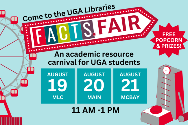 graphic with information about UGA Libraries FACTS. Fair with an image of a ferris wheel. Events August 19, 20, 21, from 11 am to 1 pm